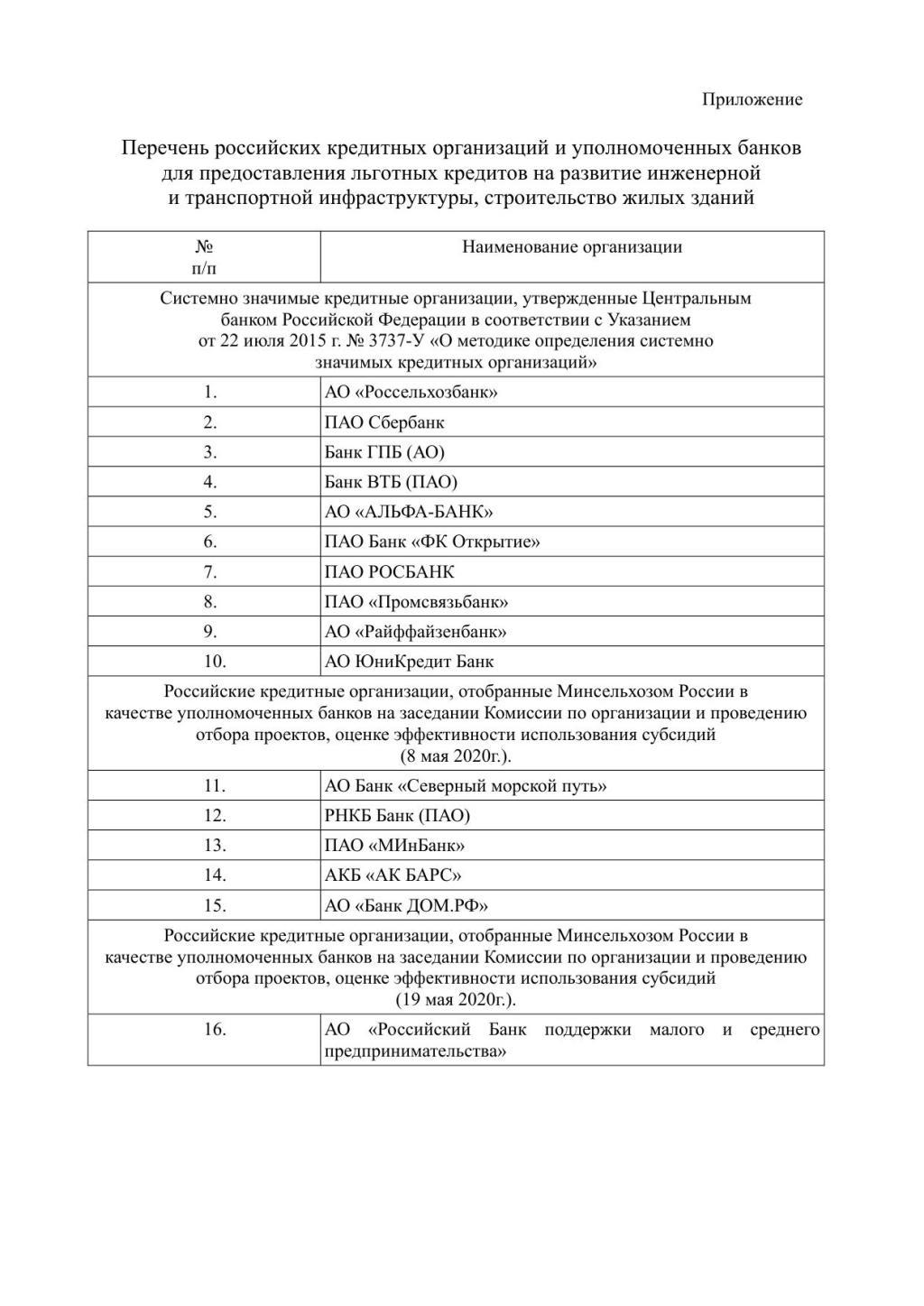 2. Индивидуальным предпринимателям и организациям, зарегистрированным на сельских территориях, в рамках постановления Правительства Российской Федерации от 24 декабря 2019 года № 1804 (сумма кредита зависит от количества созданных новых постоянных рабочих мест в период кредитования, со ставкой 1 - 5 процентов годовых), на развитие инженерной и транспортной инфраструктуры, строительство жилых зданий (перечень уполномоченных банков представлен в приложении).