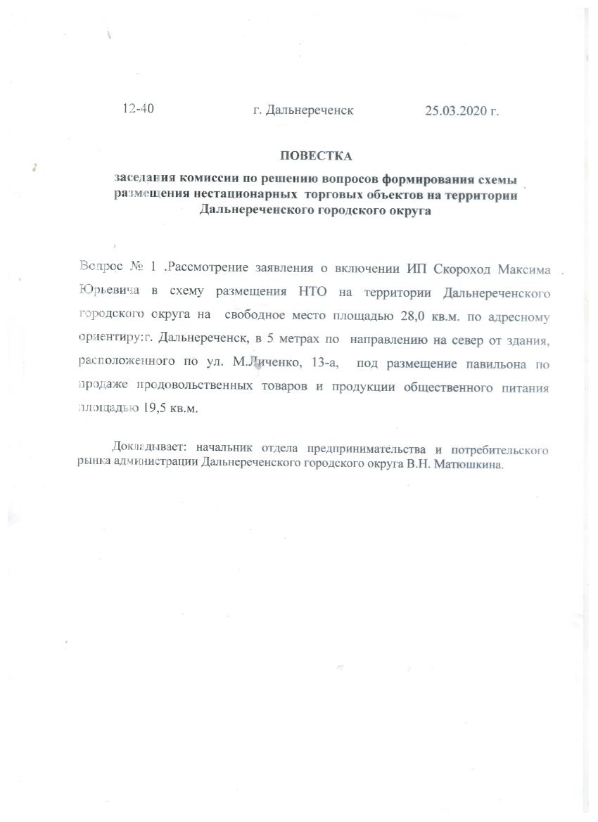 Повестка от 25.03.2020 г. заседания комиссии по решению вопросов формирования схемы размещения нестационарных торговых объектов на территории Дальнереченского городского округа