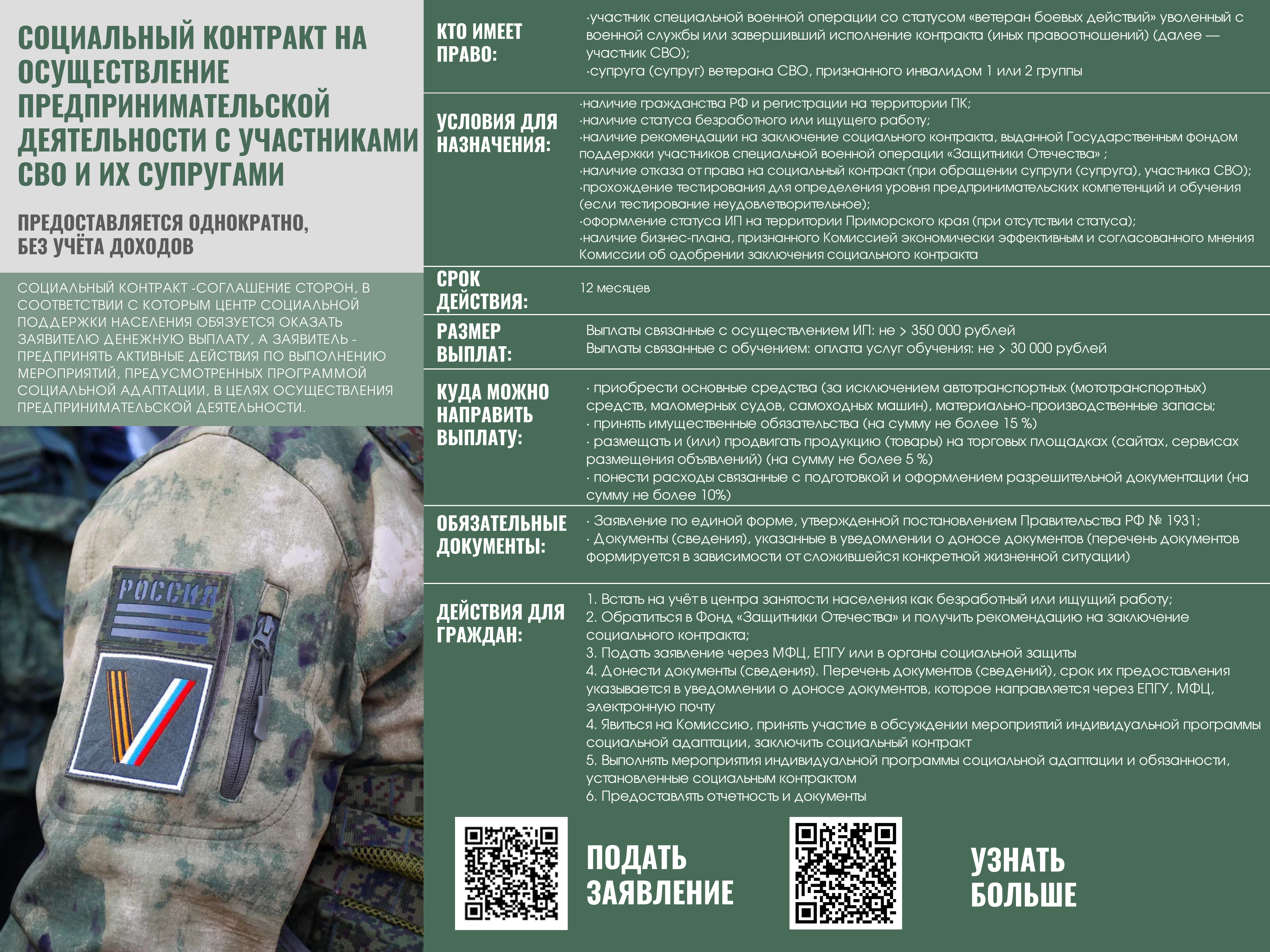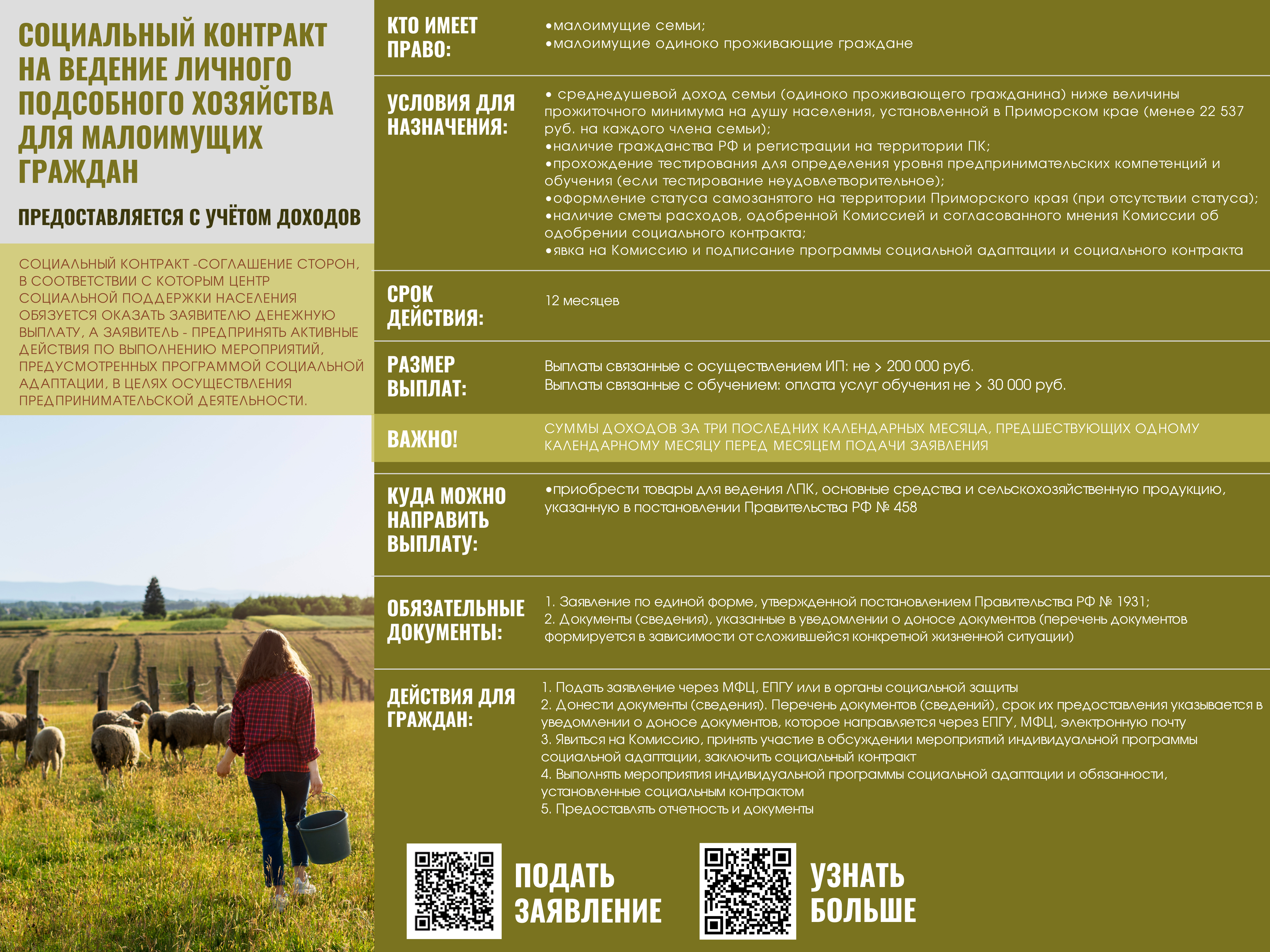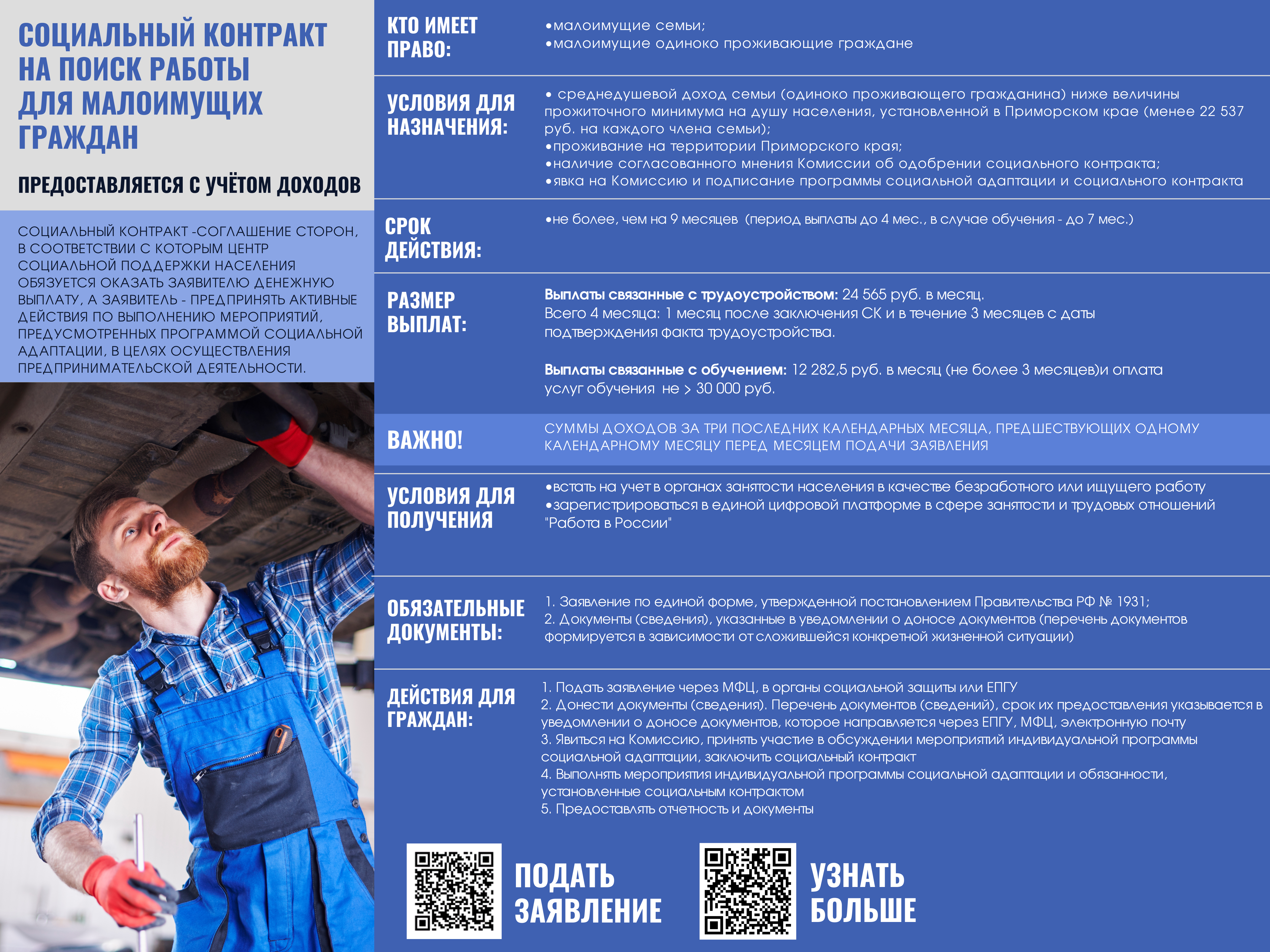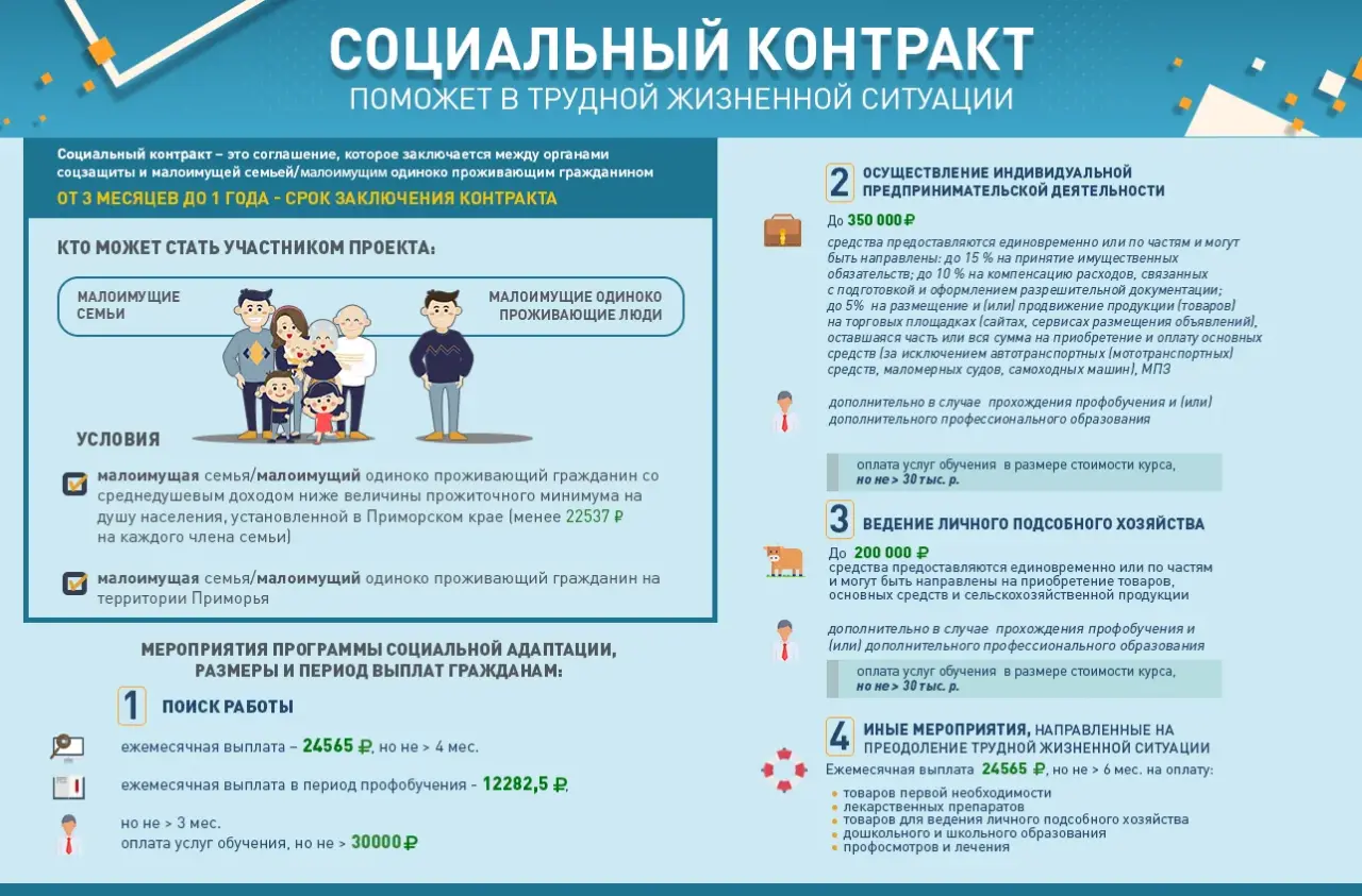 Если Ваш среднедушевой доход и/или доход Вашей семьи по не зависящим от Вас причинам ниже величины прожиточного минимума на душу населения, установленной в Приморском крае (менее 22537 руб. на каждого члена семьи), предлагаем рассмотреть возможность получения государственной социальной помощи на основании социального контракта.