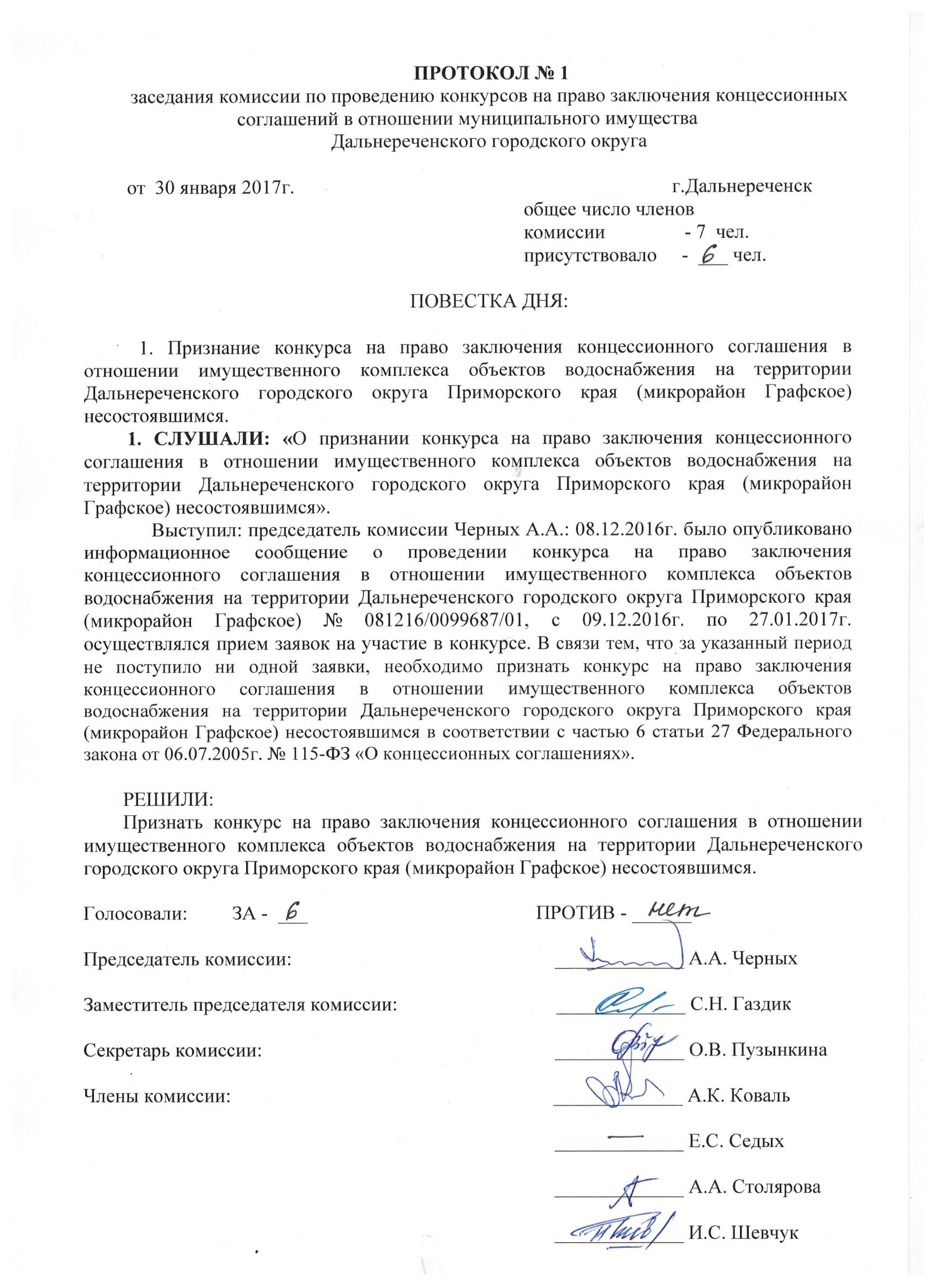 Конкурс на право заключения концессионного соглашения в отношении имущественного комплекса объектов водоснабжения на территории Дальнереченского городского округа Приморского края (микрорайон Графское) не состоялся