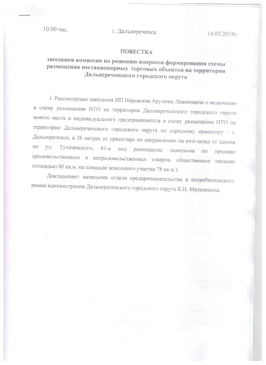 Повестка от 14.03.2019 г. заседания комиссии по решению вопросов формирования схемы размещения нестационарных торговых объектов на территории Дальнереченского городского округа